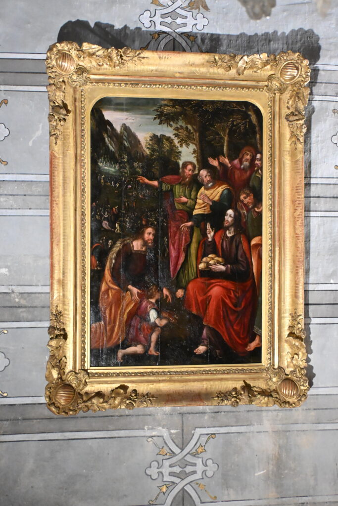 Au dessous, vous pouvez admirer le tableau de « la multiplication des pains ». Cette œuvre, peinte sur bois, date vraisemblablement du XVIe siècle, et pourrait, d’après sa restauratrice, avoir pour origine une école hollandaise. Le cadre, lui, date du XVIIIe siècle. Donné en 1994 par Mlle Geneviève Duret à la paroisse de Fures, ce tableau connut un parcours mouvementé pendant vingt-cinq ans, avant sa restauration en 2024.