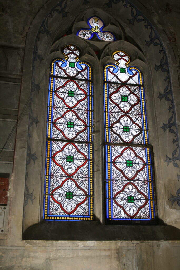 Le vitrail à deux panneaux et motifs non figuratifs a été fabriqué vraisemblablement par Gubian et Roy-jeune, maîtres-verriers à Lyon en 1866.