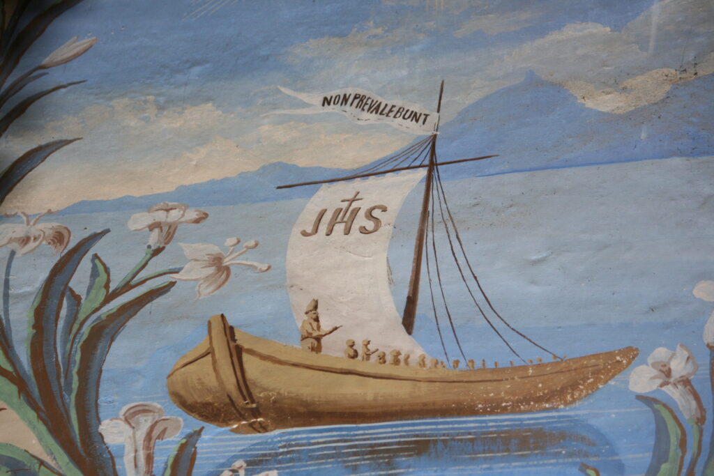 La voile du bateau comporte les lettres « JHS », traduction imparfaite des initiales du Christ en grec « IHS » . Sur l’oriflamme est inscrite la devise : « non prevalebunt » signifiant littéralement : ils ou elles ne prévaudront pas. Elle se rapporte semble-t-il à la phrase de la bible, prononcée par Jésus « Et moi, je te dis que tu es Pierre, et que sur cette pierre je bâtirai mon Eglise, et que les portes du séjour des morts ne prévaudront point contre elle».