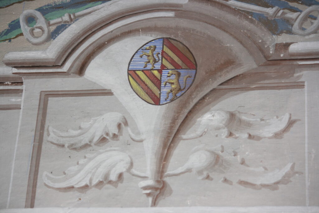 Le médaillon semble reposer sur un socle réalisé en trompe-l’œil décoré d’un blason dont nous n’avons pas retrouvé l’appartenance