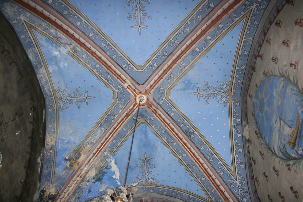Les panneaux du plafond, sont animés de crucifix ornés de motifs végétaux, l’ensemble sur un fond bleu étoilé que nous retrouverons tout au long de la visite.